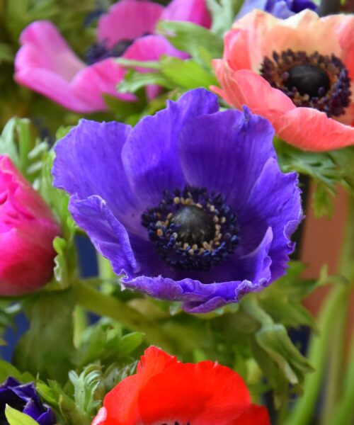 Single flowered and brightly coloured with dark purple-red foliage.